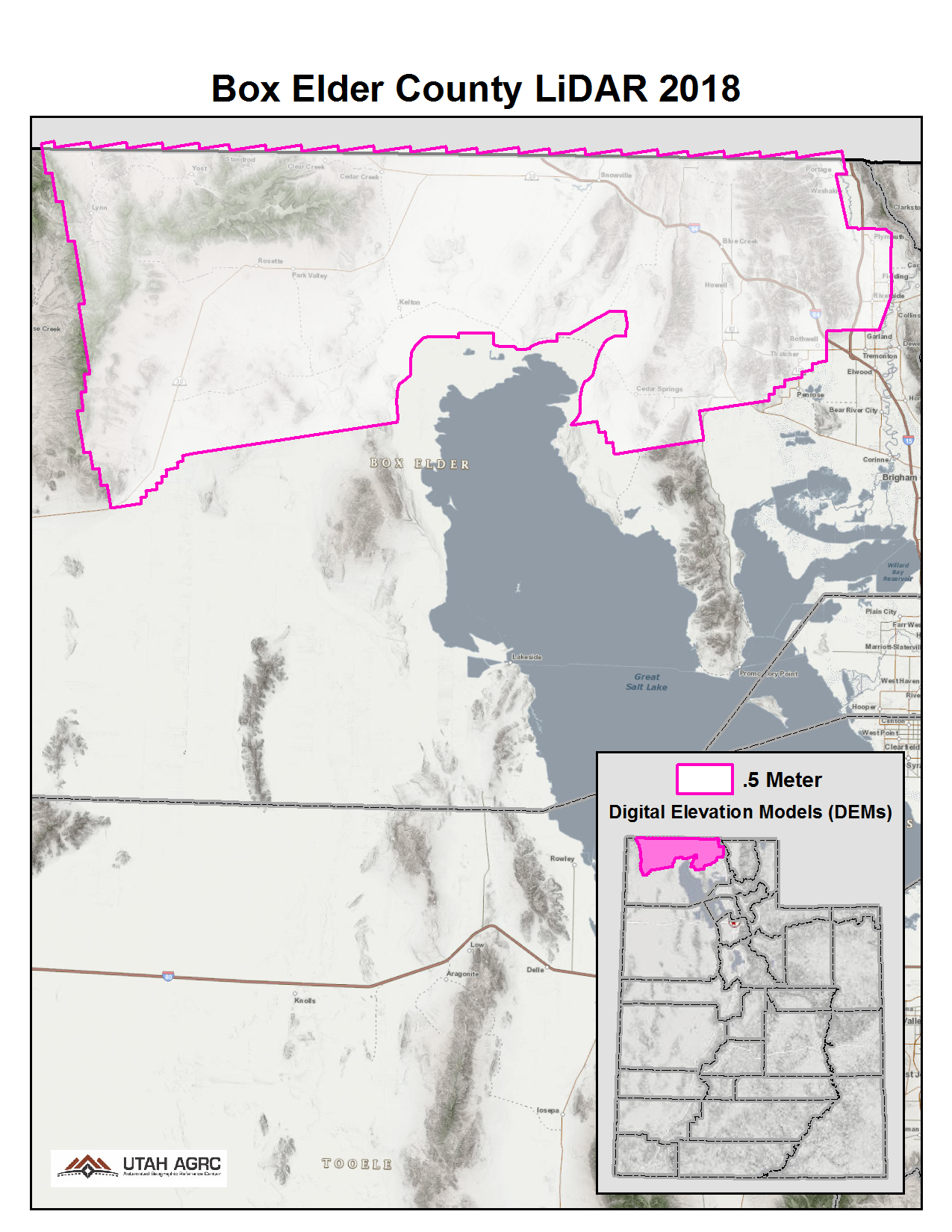 During 2011 UGRC and Utah Geological Survey (UGS) acquired ~1,870 square miles of .85 meter Lidar for areas including the north, east, and south sides of the Great Salt Lake, Cedar Valley, Hurricane Fault, and more. The 1 meter bare-earth DEMs in .img format are available for download. The DSMs and LAS classified point clouds are available from Open Topography , opens in a new tab .