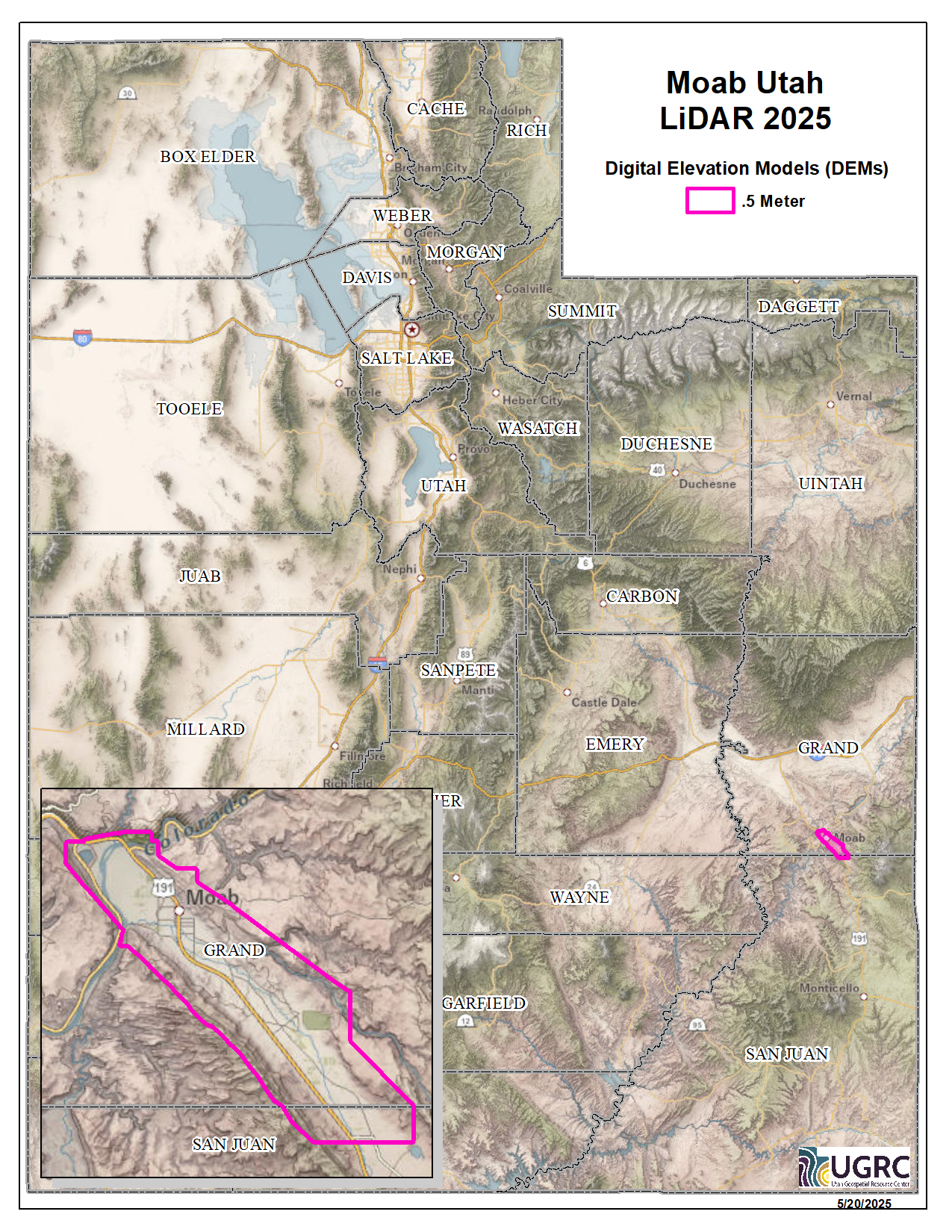 During 2025 Grand County, UT acquired ~31 square miles of 8 points per meter Quality Level 1 Lidar of Moab City. The 0.5 resolution bare earth DEMs and first-return/highest-hit DSMs in .tif format have a 10.0cm vertical RMSE accuracy and are available for download. This elevation data was collected March 23rd, 2025.